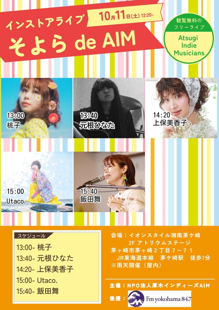 そよらdeAIM SCHEDULE 2025/10/11(土) 13:00 - イオンスタイル湘南茅ヶ崎 10月11日 インストアライブ 『そよらdeAIM』 13:00~ 30分ほど URLをコピーする 報告する